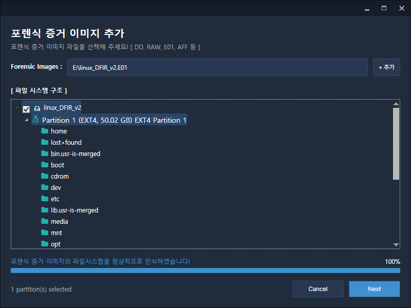 이미지 파일을 추가하면 파일시스템을 탐지 후 디렉터리 구조를 시각화 하여 제공합니다.