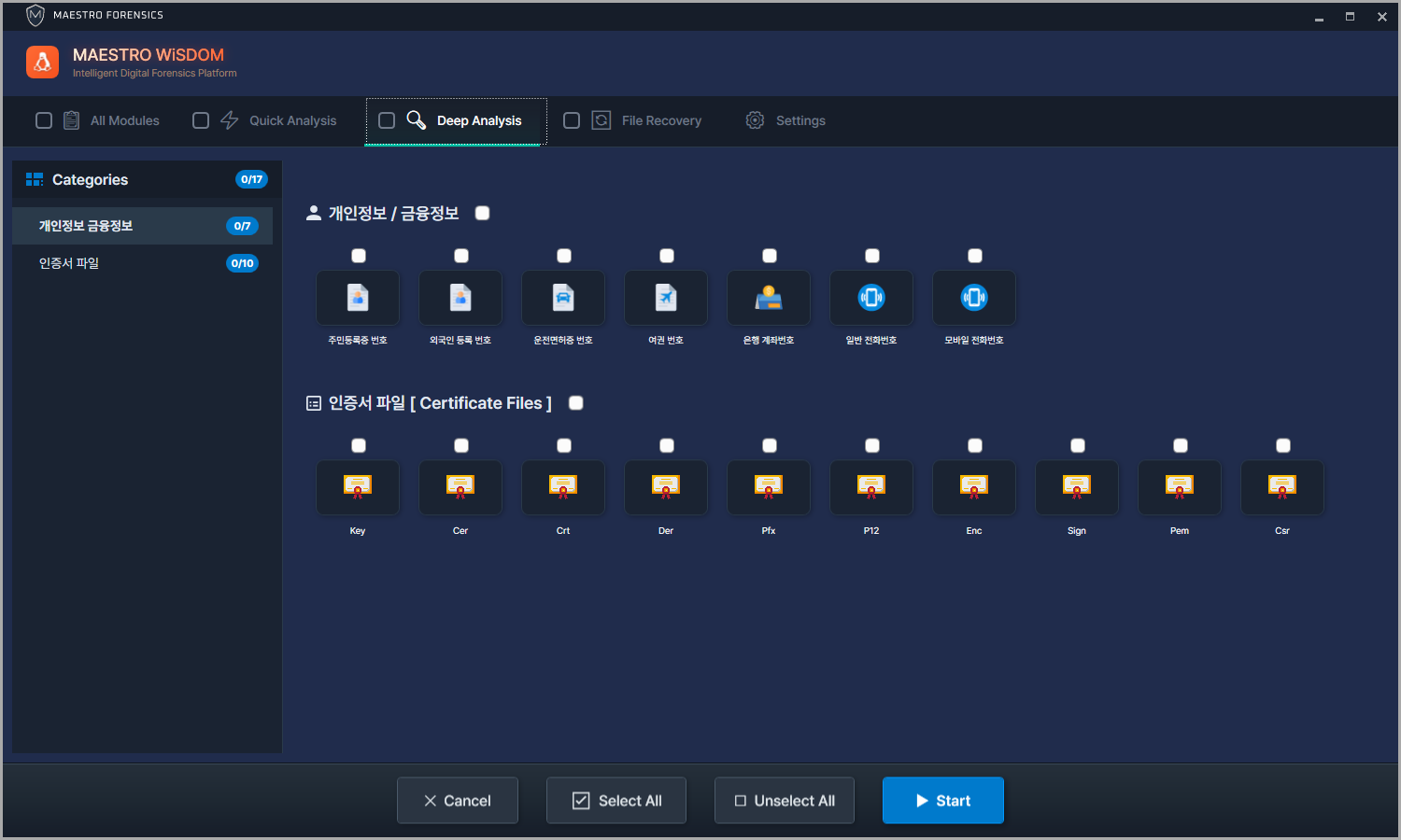 로우 데이터 분석( Deep Analysis )은 개인정보가 포함된 파일 및 인정서 파일을 전문으로 추출하는 아티팩트 선택 영역입니다.