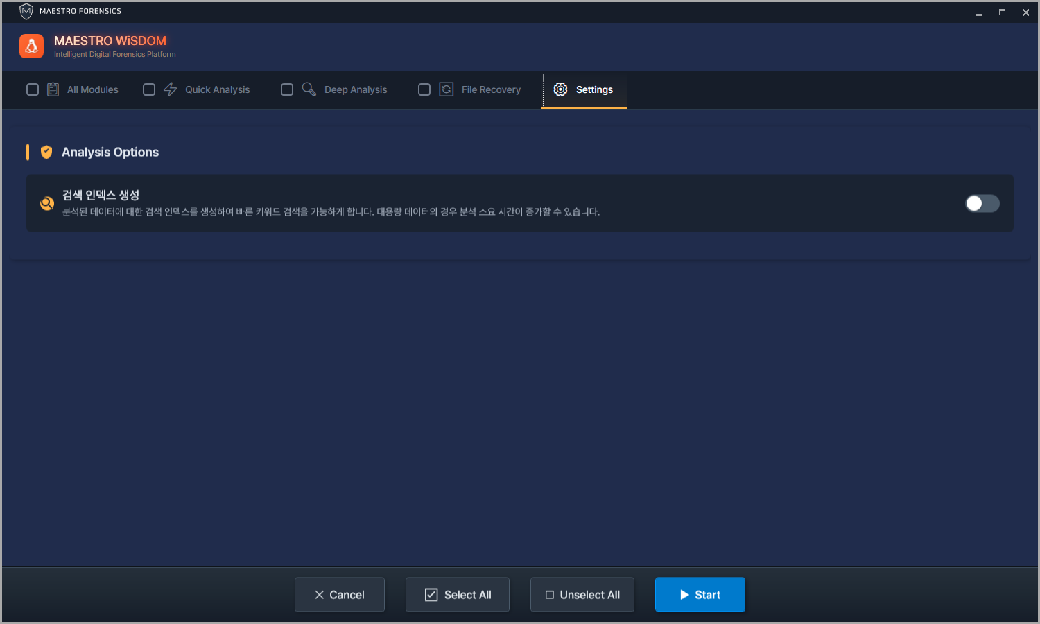 셋팅( Settings ) 항목은 인덱싱 유무를 선택할 수 있으며, 필요한 경우 수집 기능을 제외 하여 초기 분석을 빠르게 완료할 수 있습니다.