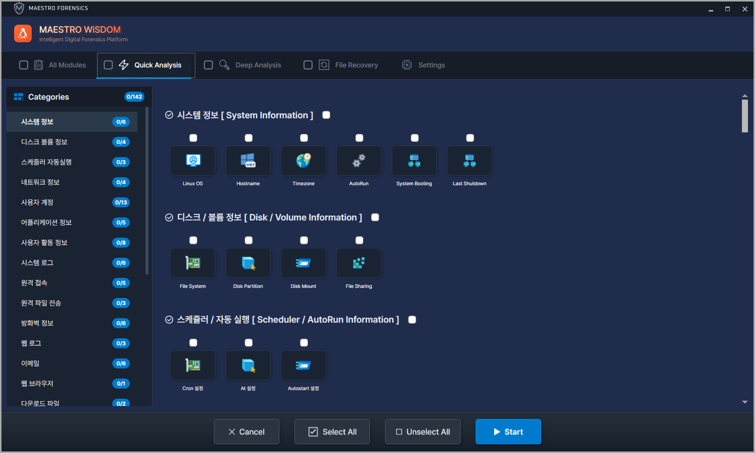 [ All Modules ]의 경우 모든 아티팩트를 한번에 수집하지만 프로세싱 속도가 가장 느린 추출 방법입니다.
