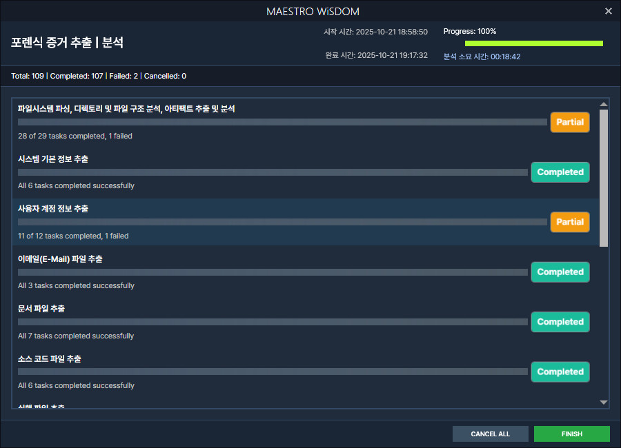 아티팩트 선택 종료 후 추출을 시작하면 스크린샷과 같이 프로세싱 진행 상태를 확인할 수 있습니다.