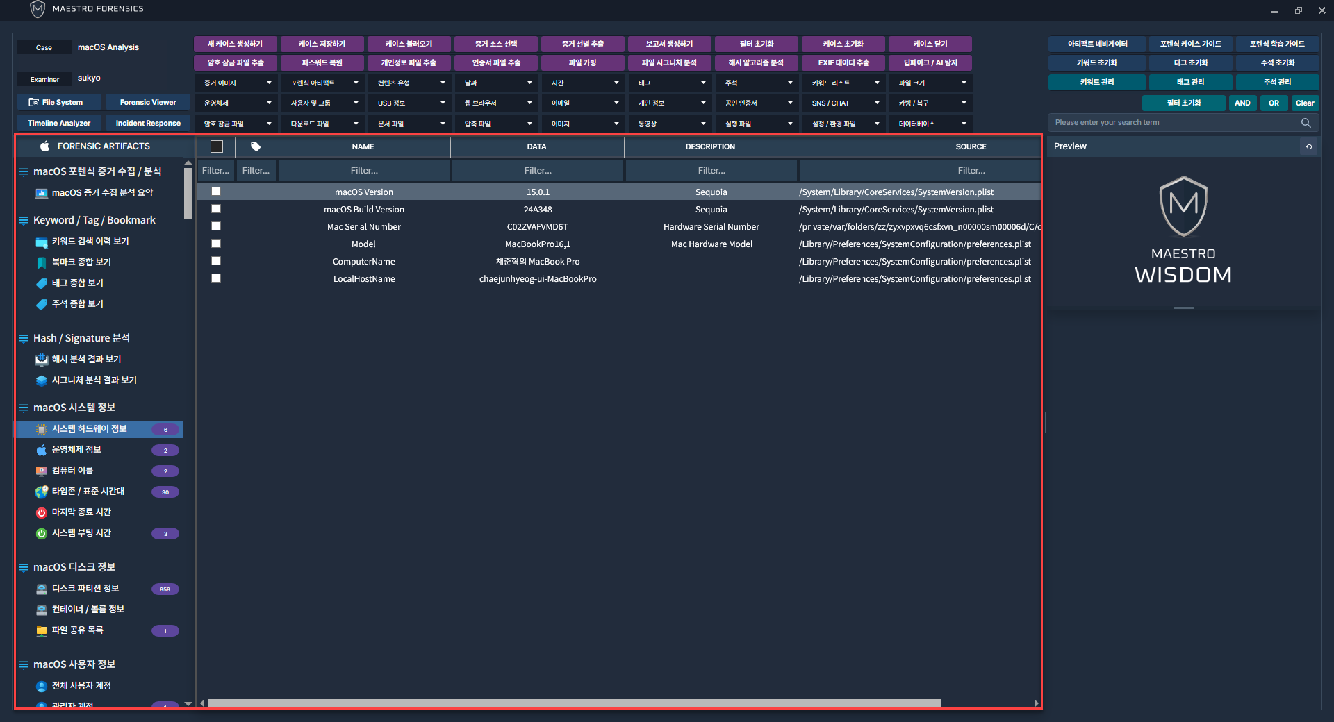 MAESTRO WiSDOM의 아티팩트 분석 모듈 중 [ 파일 시스템, 개인정보 파일, 암호 잠금 파일 ] 등 로우 분석 선택 화면입니다.