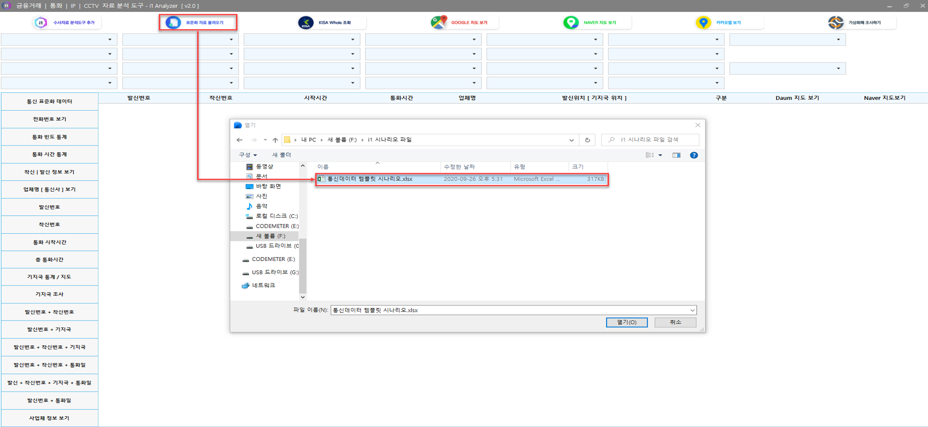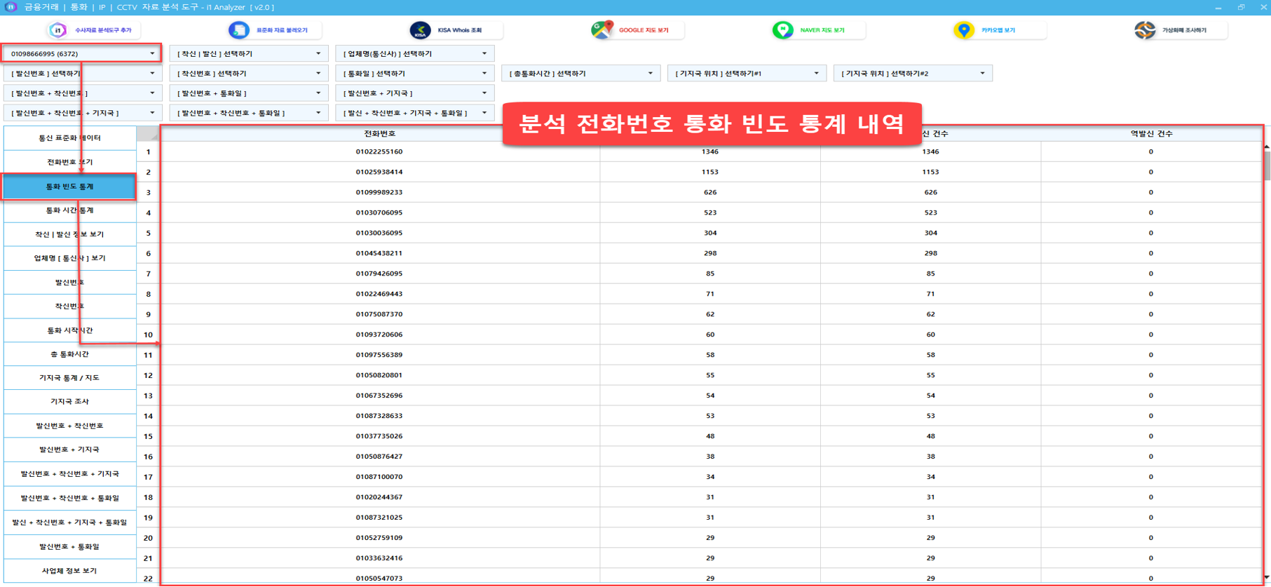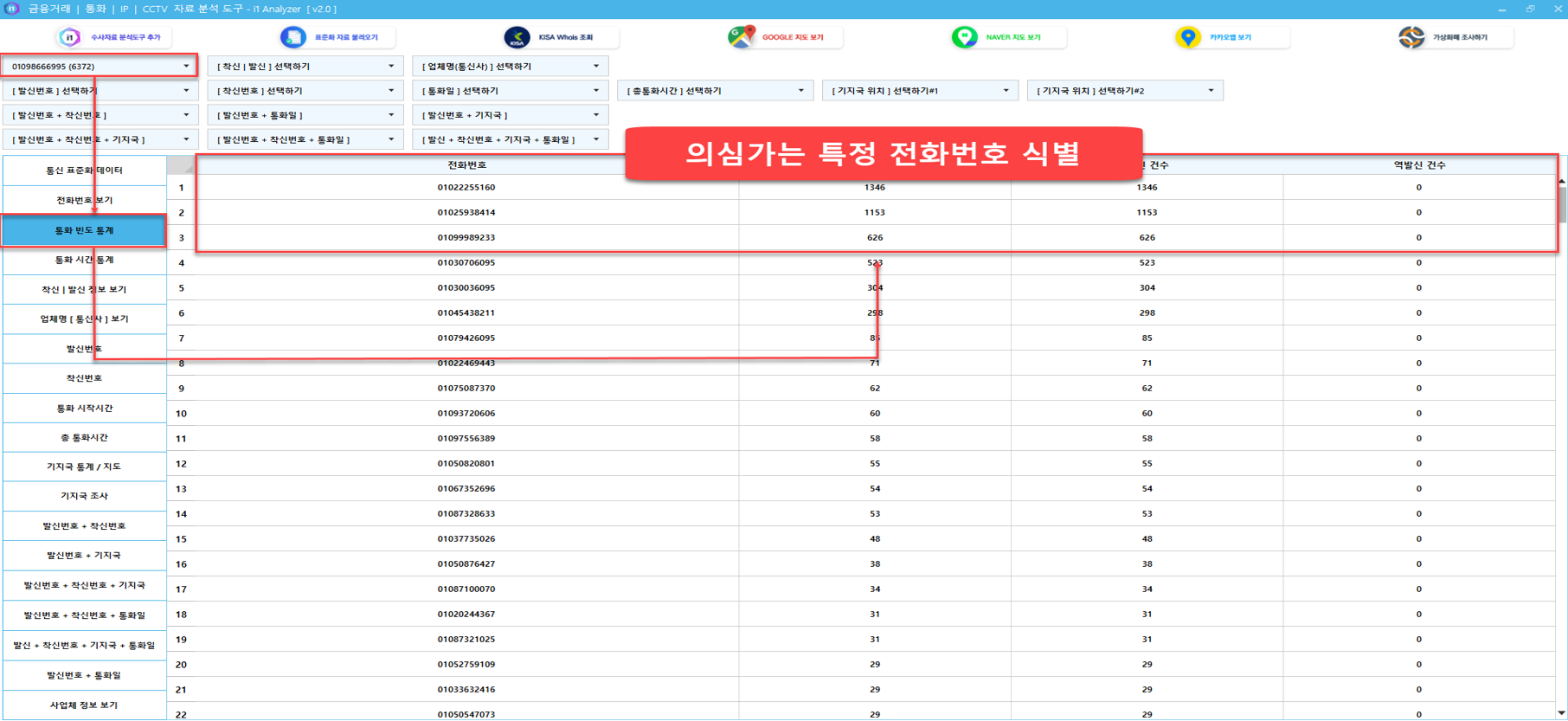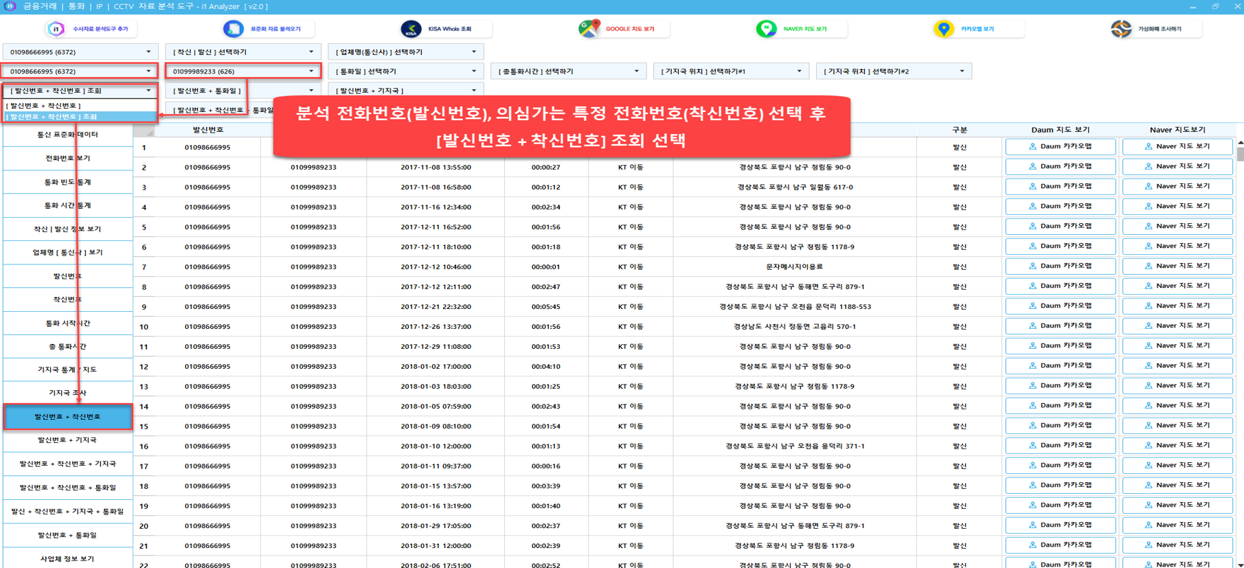 [발신번호+착신번호+기지국] 조회 필터를 이용해 먼저, 분석 전화번호 + 의심가는 특정 전화번호 + 발신위치 분석