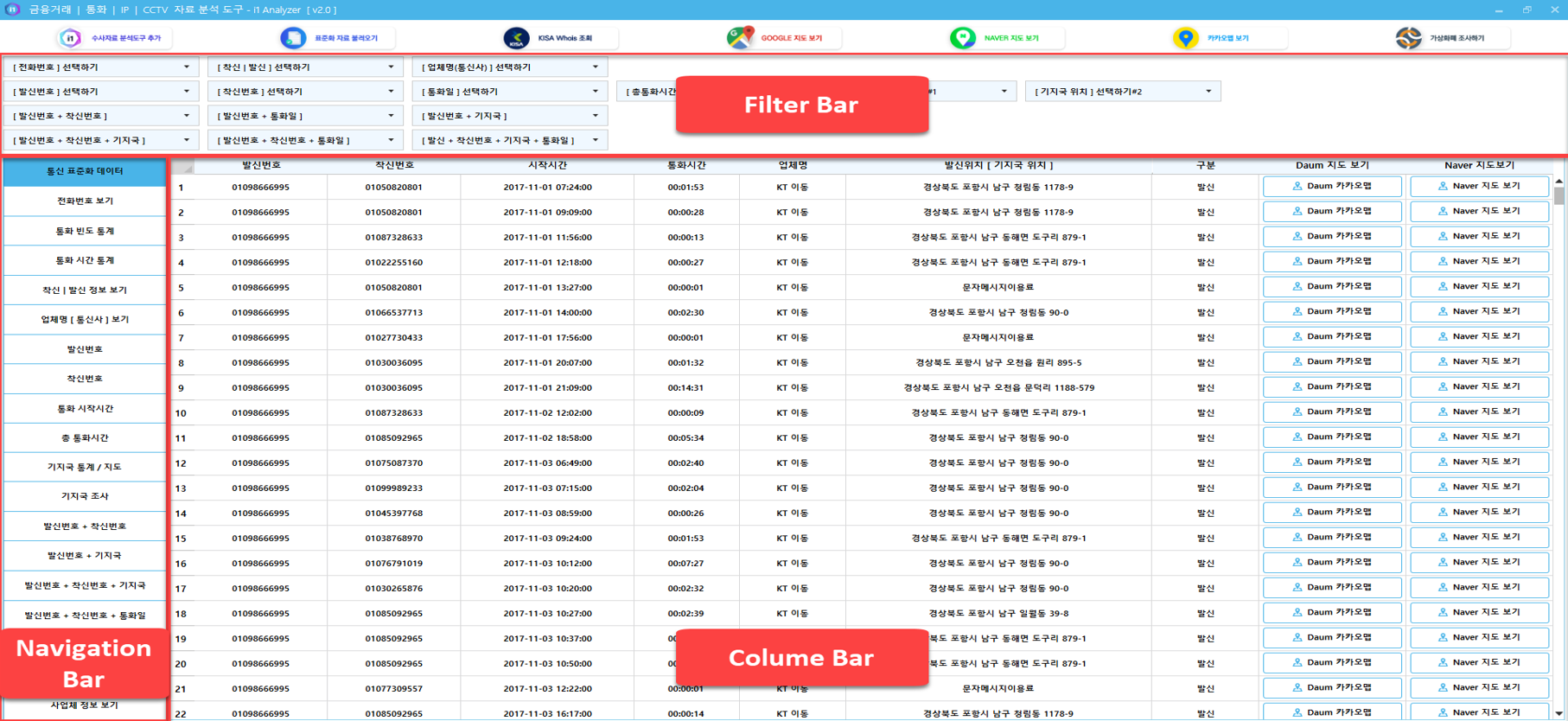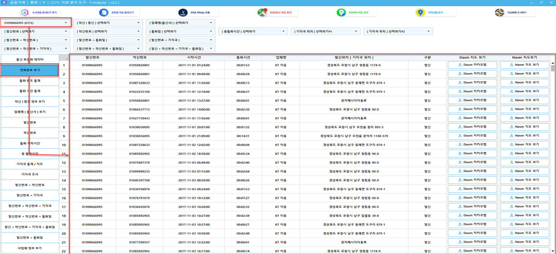 의심가는 특정 전화 번호와의 접선/접촉 가능성 확인을 위해 먼저, 분석 전화번호의 발신위치 정보를 파악합니다.