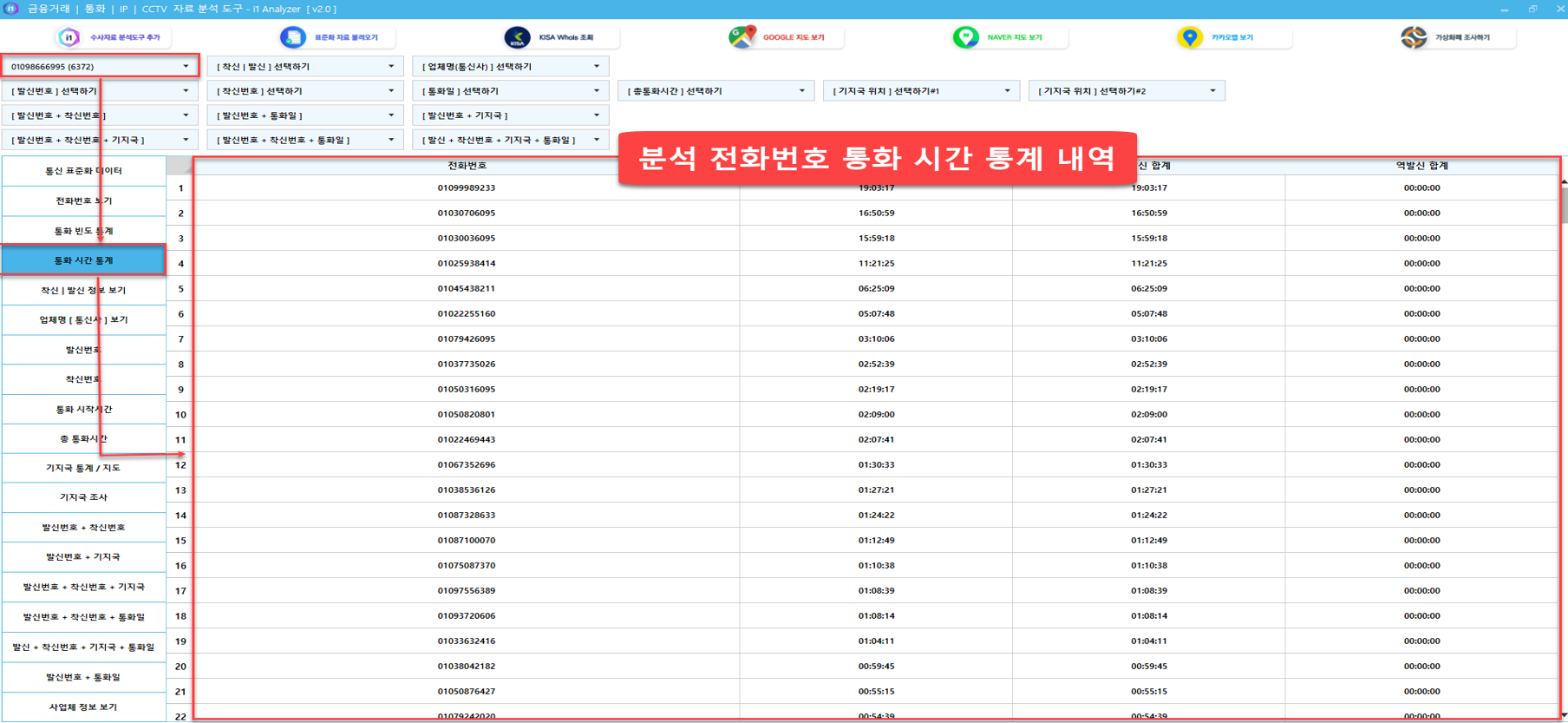 1. 전화번호 필터를 통해 분석할 전화번호의 전체 통화 내역 및 통화 빈도 통계, 통화 시간 통계를 파악할 수 있습니다.