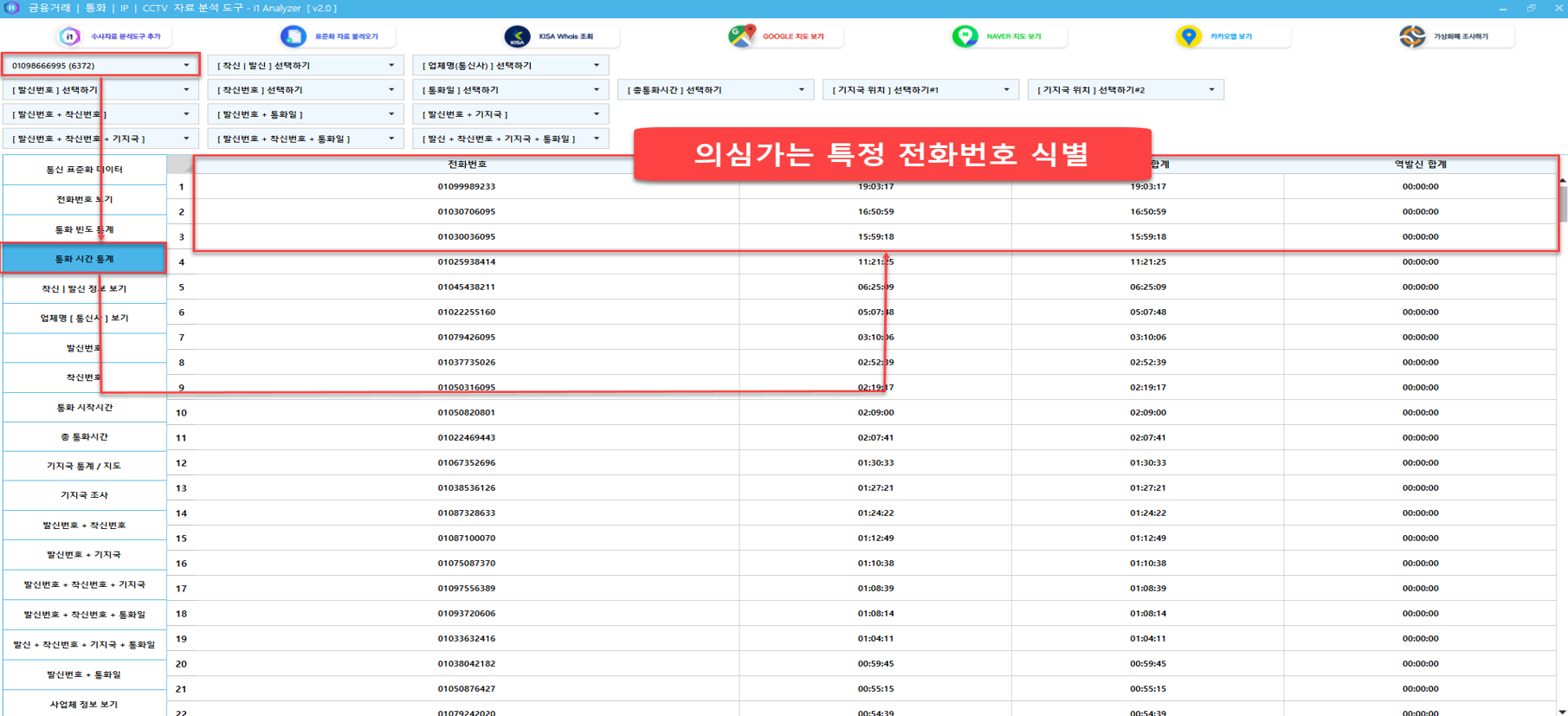 분석 전화번호의 통화 빈도 및 통화 시간을 확인하여 의심가는 특정 전화번호 확인