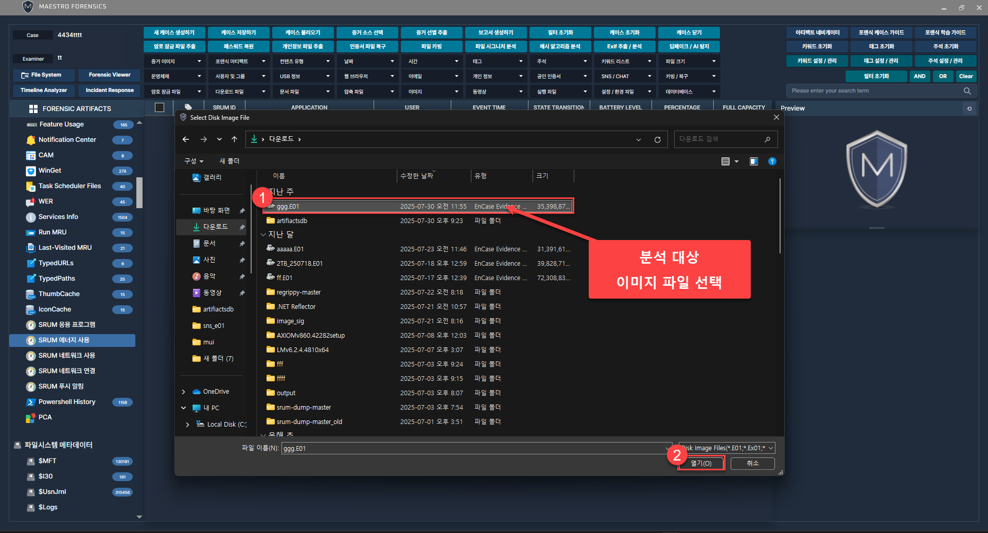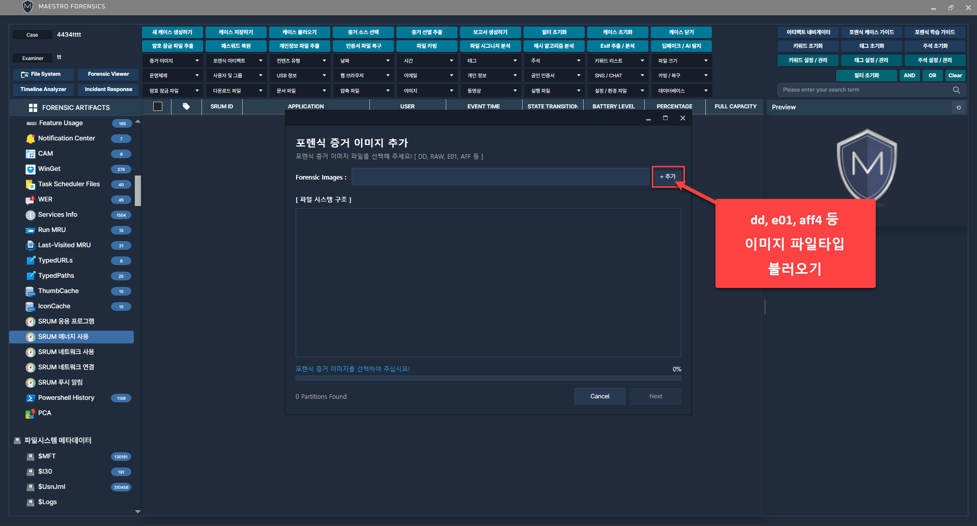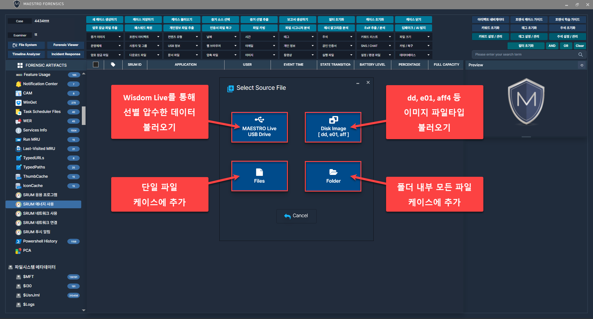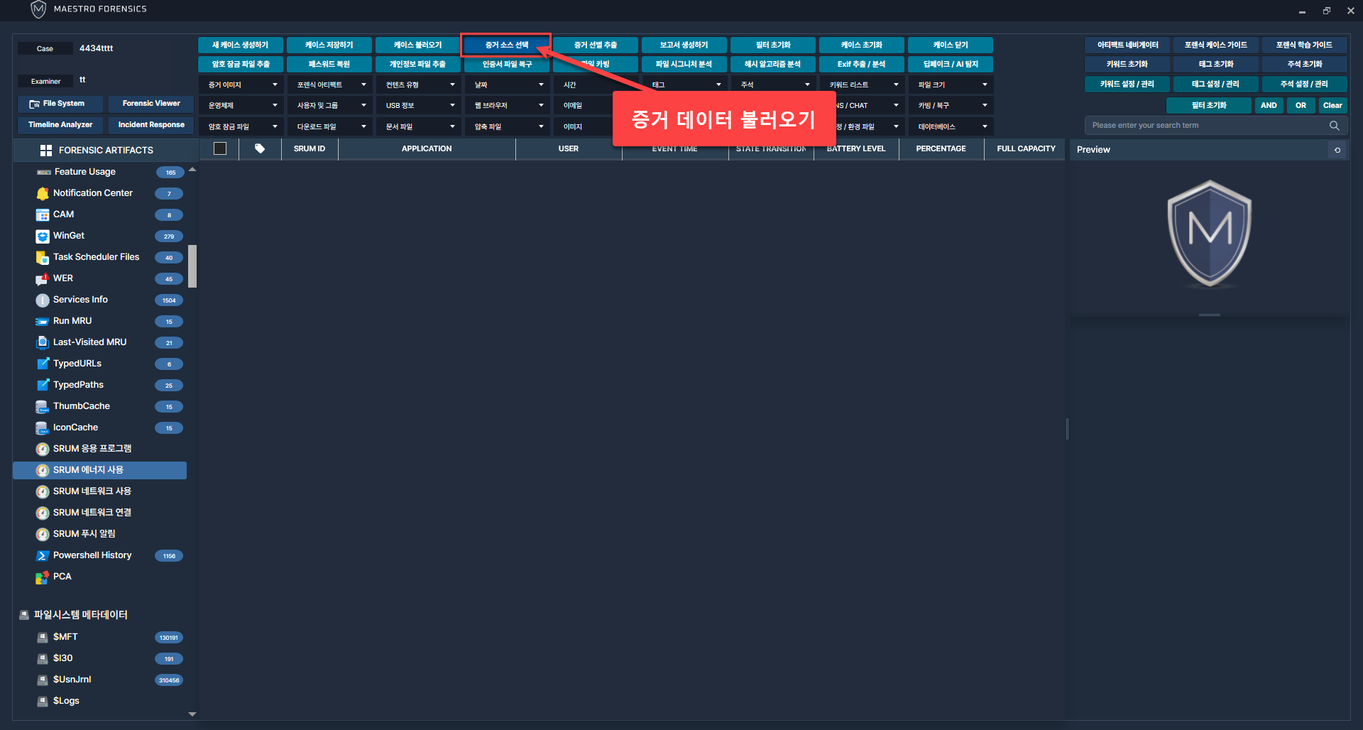 상단 [증거소스 선택] 메뉴 버튼을 통해 케이스에 증거 데이터를 추가할 수 있습니다.
