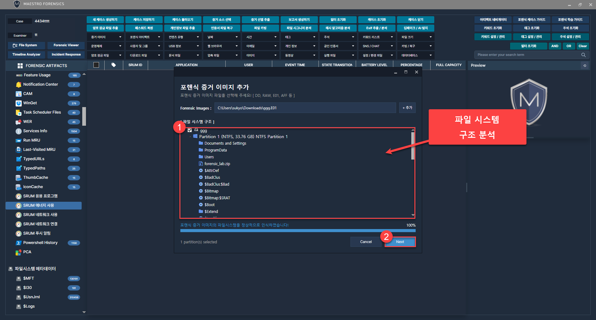 이미지 파일의 파일시스템과 내부 디렉터리 구조를 분석후 결과를 출력합니다.