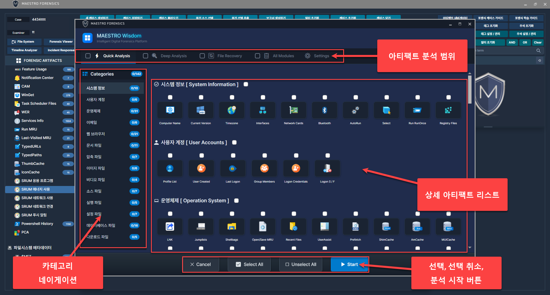 분석 대상 아티팩트를 선택합니다. 총 4가지 스캔 타입을 제공합니다.