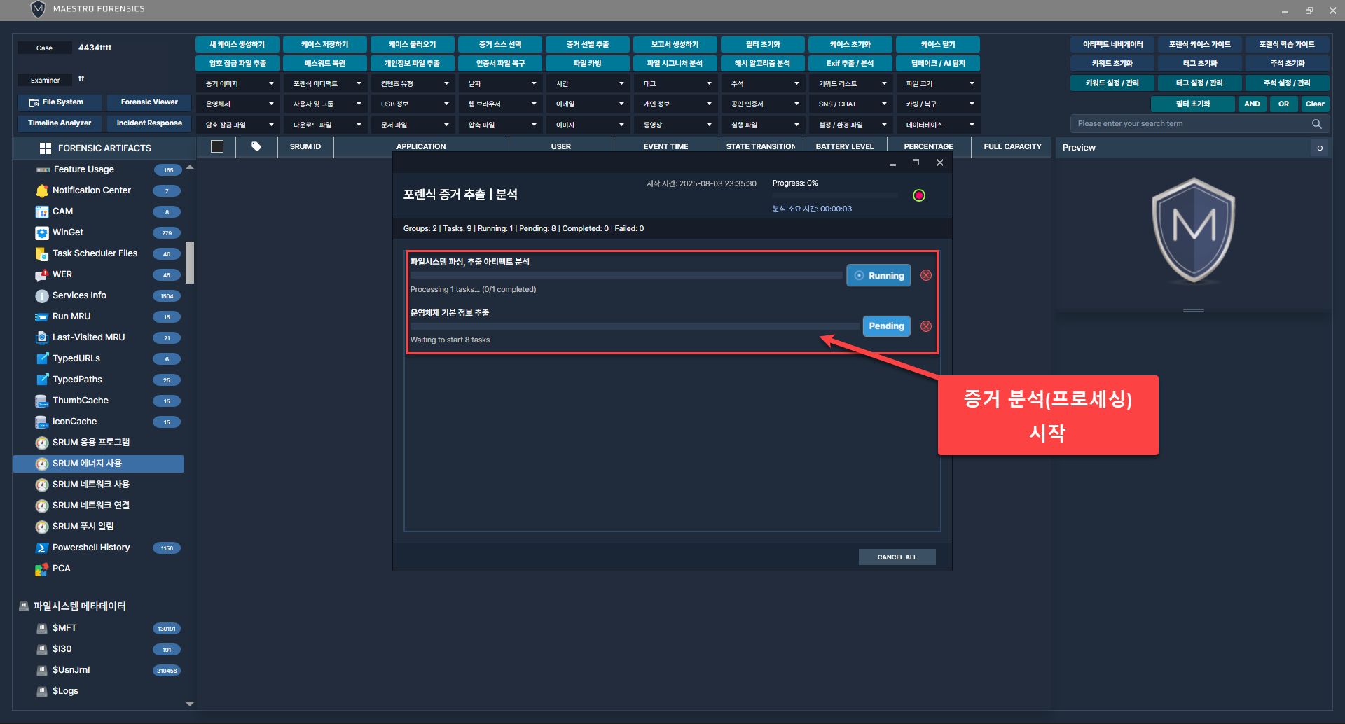 모든 과정이 종료되면 프로세싱 엔진이 동작하며 사용자가 선택한 아티팩트를 자동으로 수집/분석 후 결과를 출력합니다.