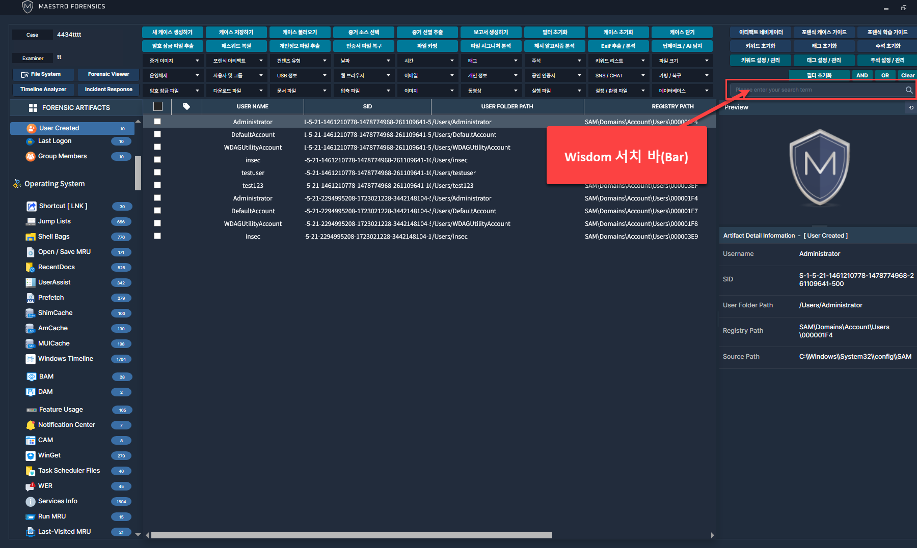 MAESTRO WiSDOM은 서치바(Search Bar)를 이용하여 필요한 키워드 검색 가능.