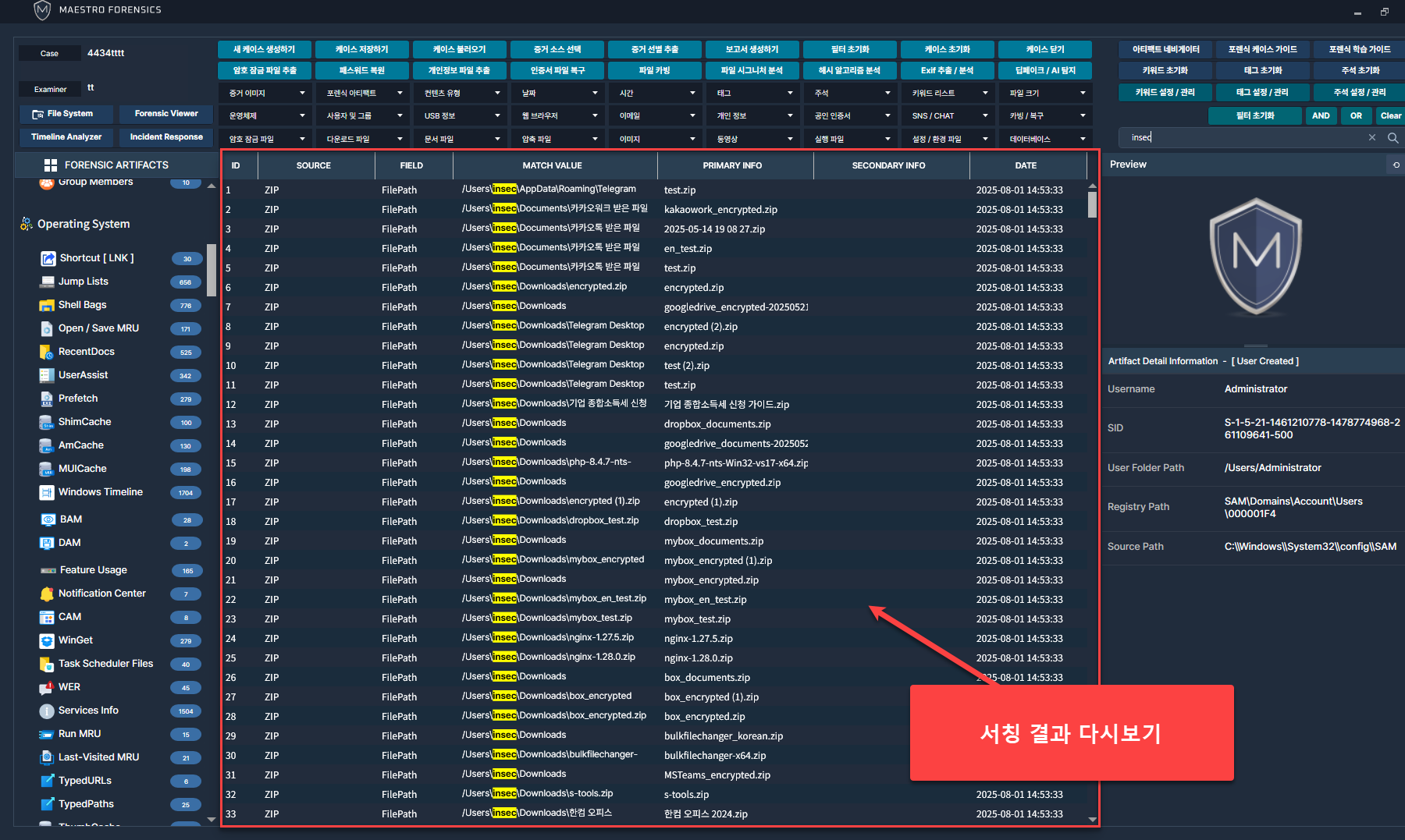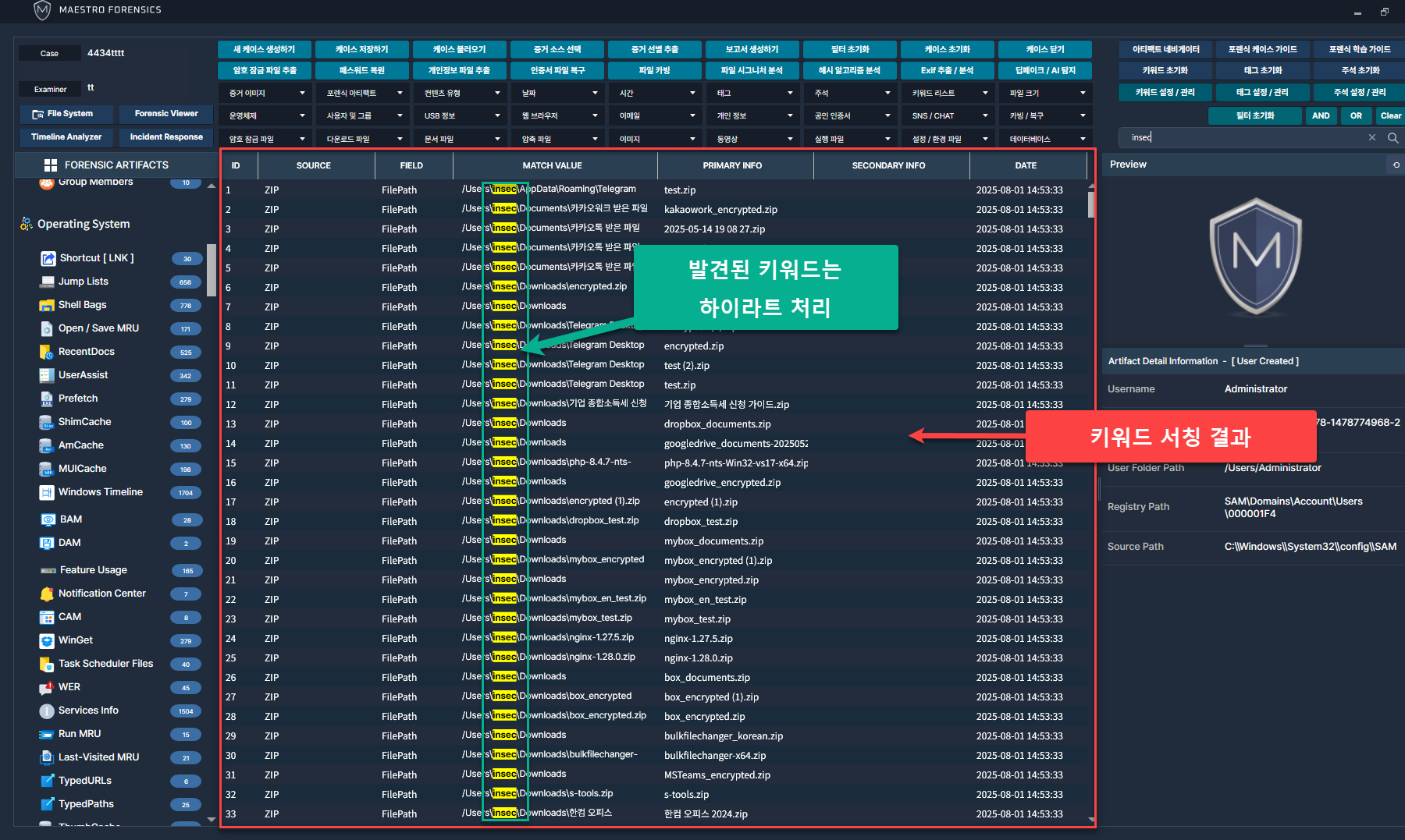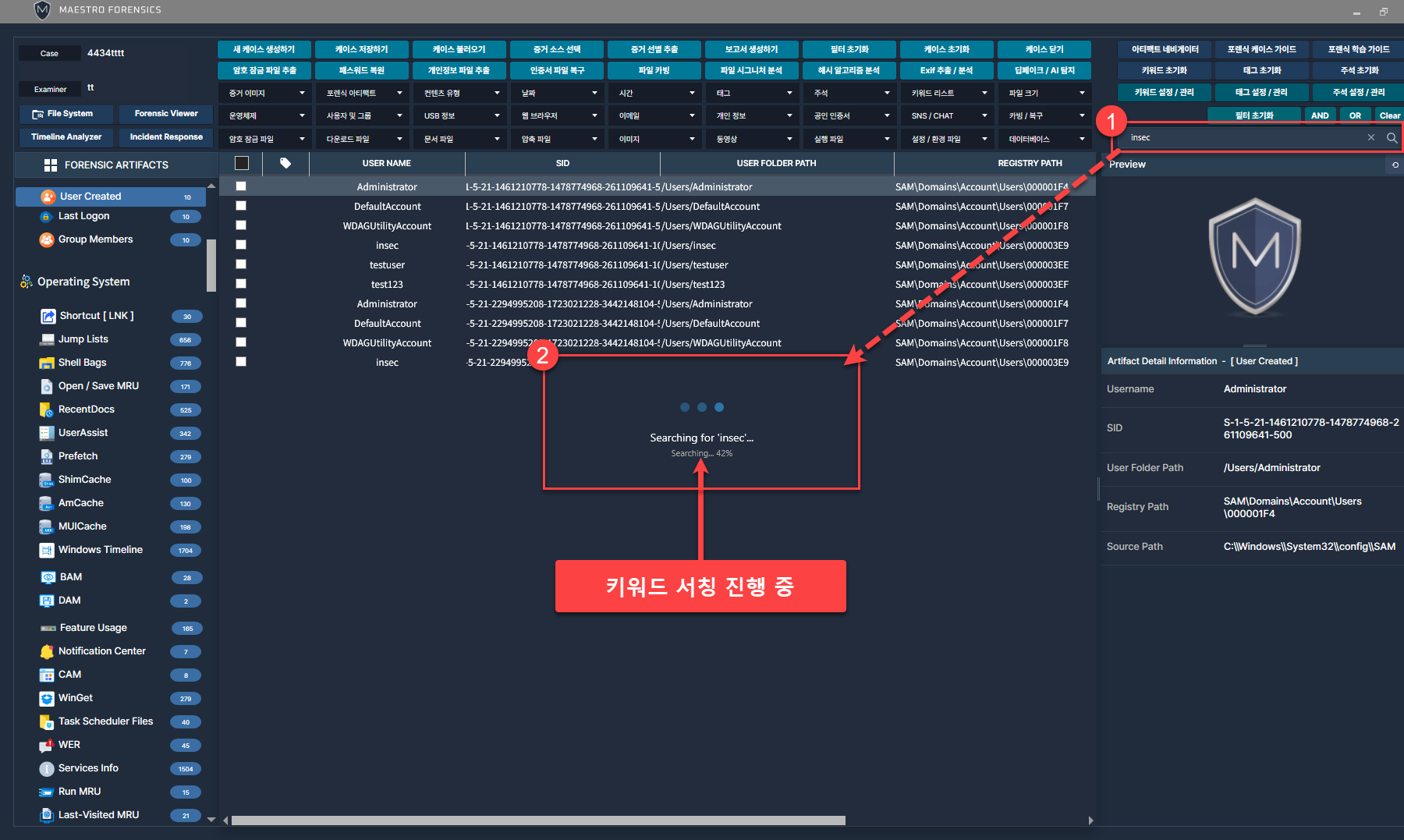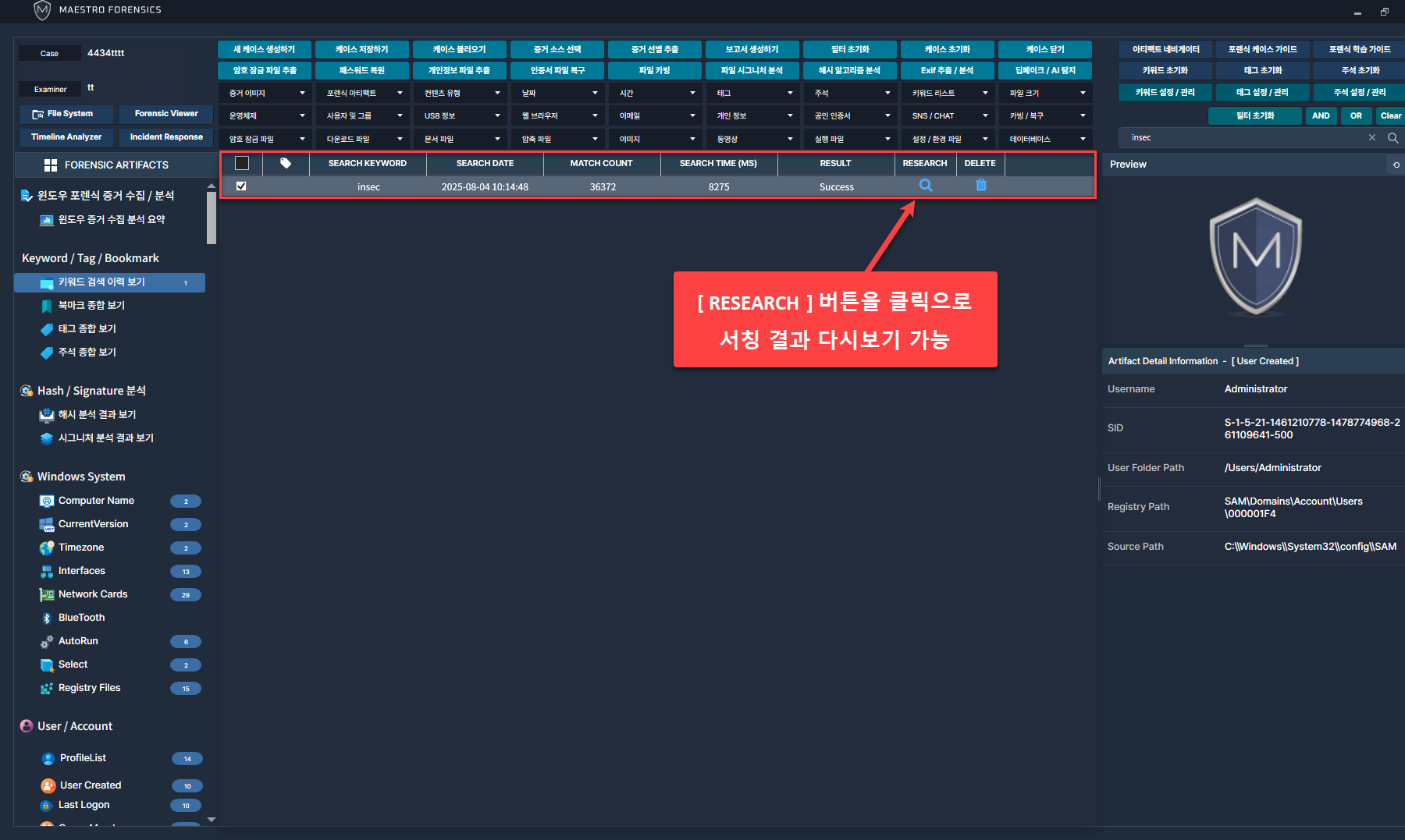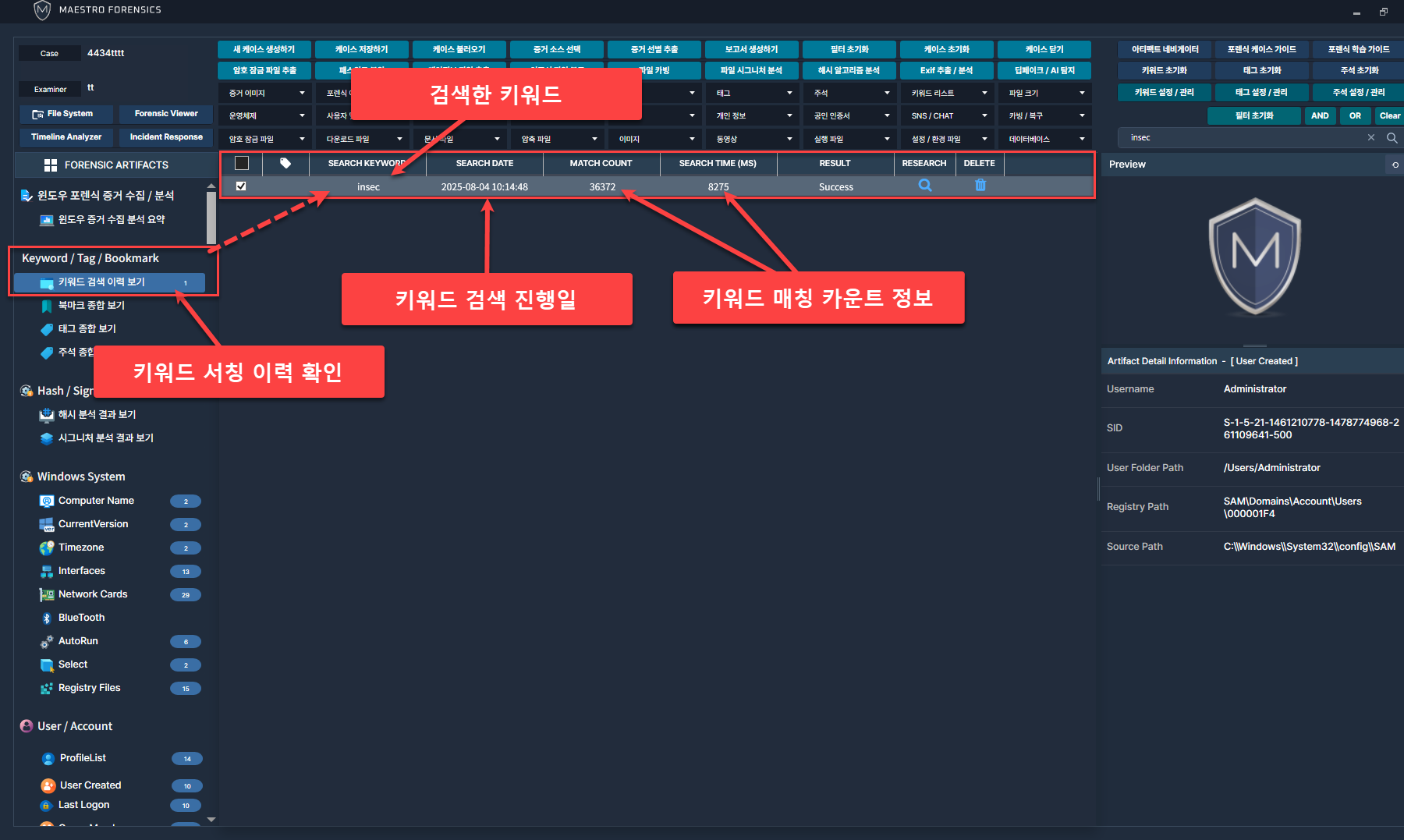 키워드 입력 후 검색버튼 클릭, 모든 아티팩트 대상으로 키워듯 서칭 시작.