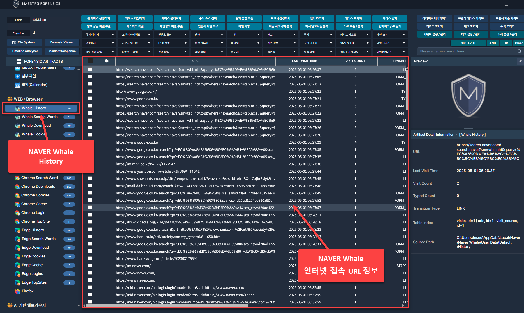 MAESTRO WiSDOM은 다양한 브라우저에서 웹사이트 방문기록, 다운로드 기록, 검색어 등 정보를 자동으로 추출.