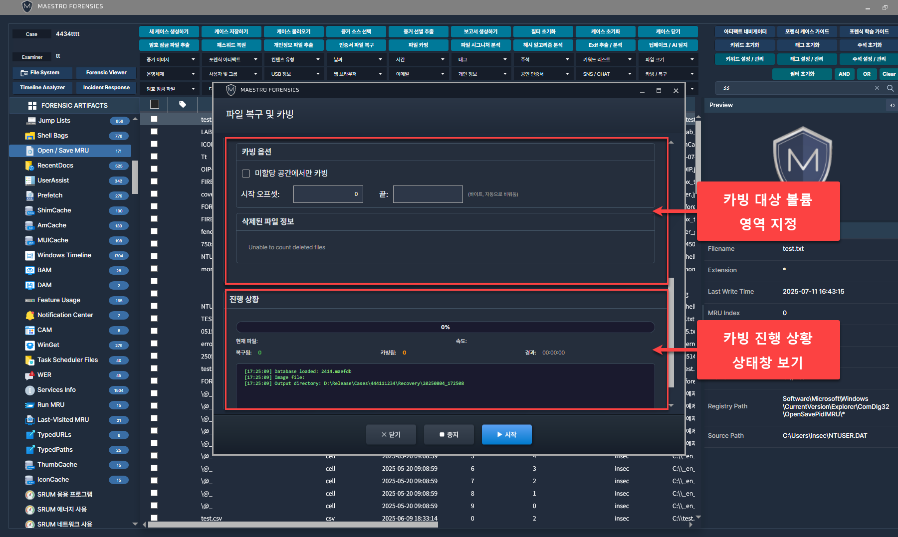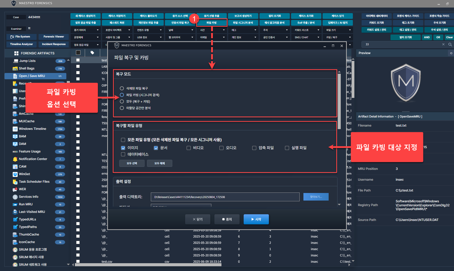 카빙 진행 방식과 카빙 대상 파일을 구분하여 데이터 복구 진행 가능.