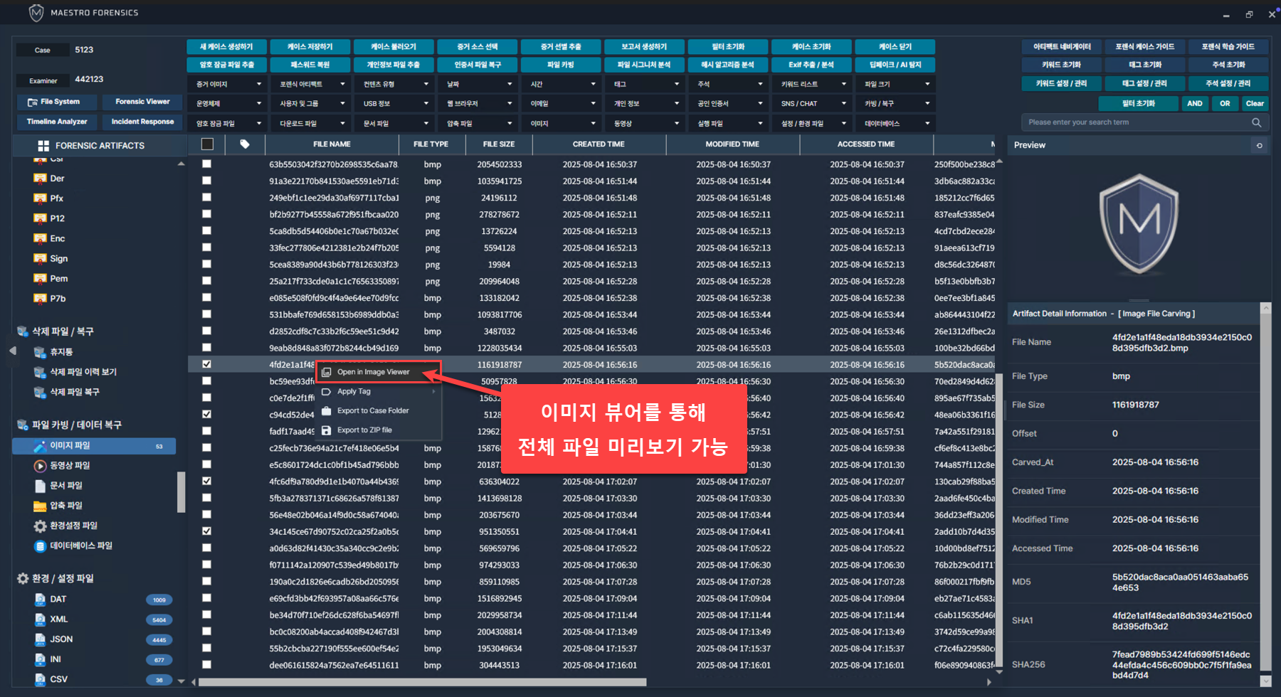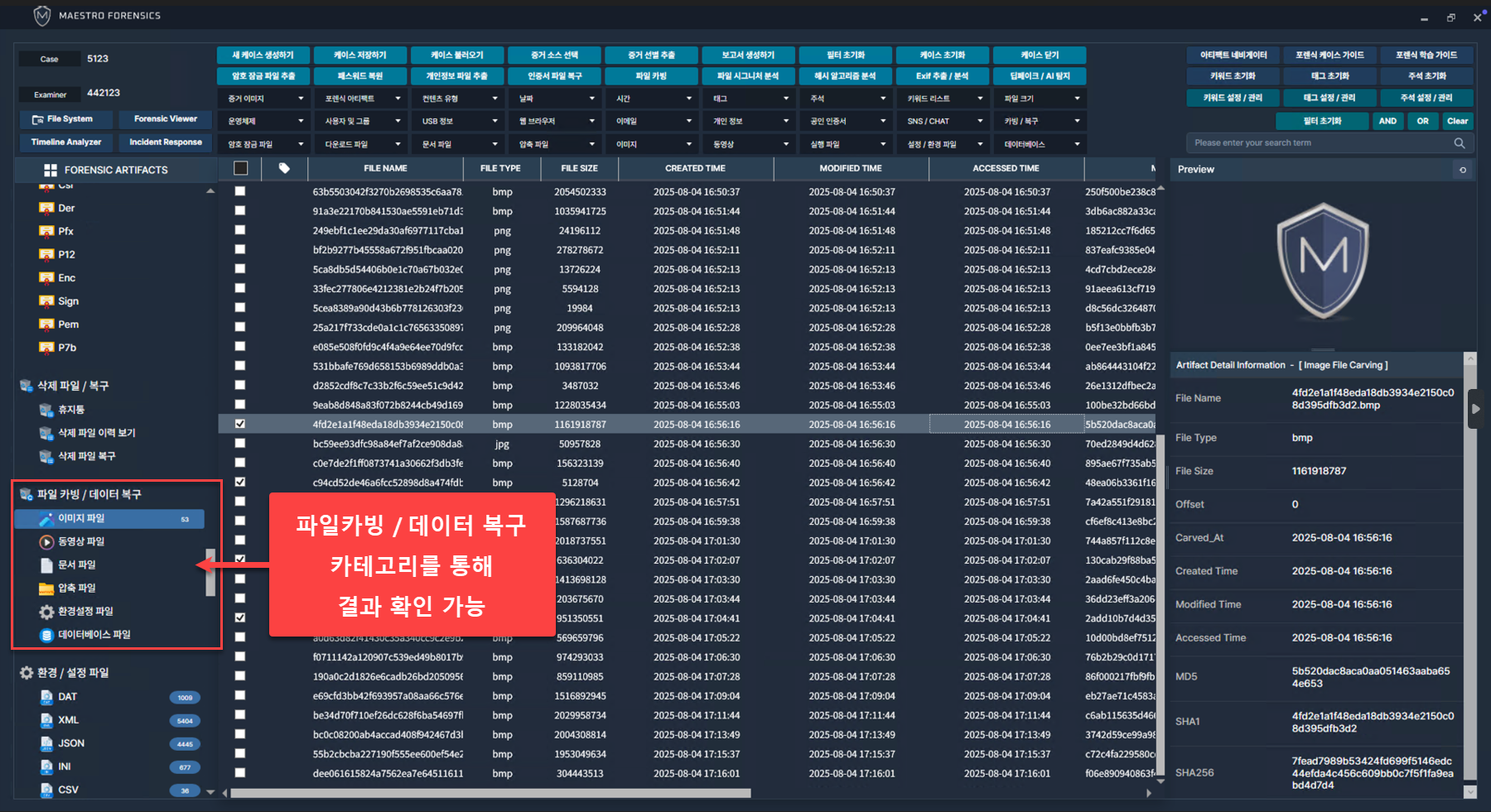 카빙 완료 시 [파일카빙 / 데이터 복구] 카테고리에서 카빙 완료된 파일 확인 가능.