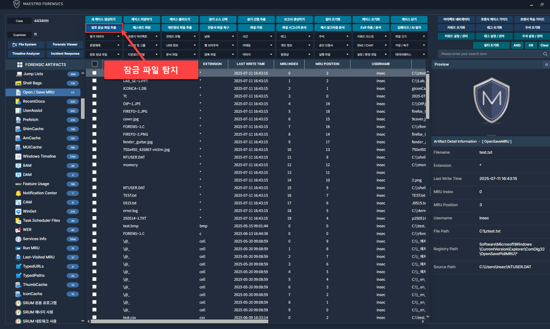 파일의 암호화 여부를 파악하기 위해 상단 메뉴에서 [암호 잠금 파일 추출] 버튼 클릭
