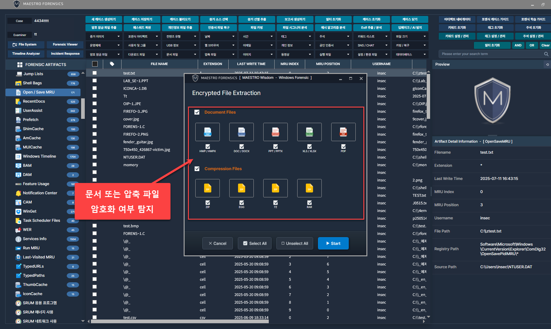 암호화 여부를 탐지할 대상 파일 선택(문서/압축파일로 구분)