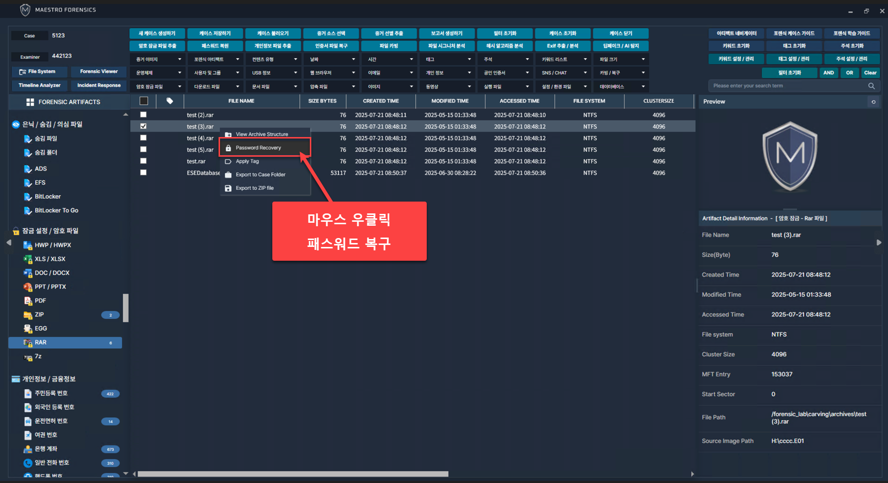 복호화 대상 파일에 [마우스 우클릭] - [Password Recovery] 옵션 선택