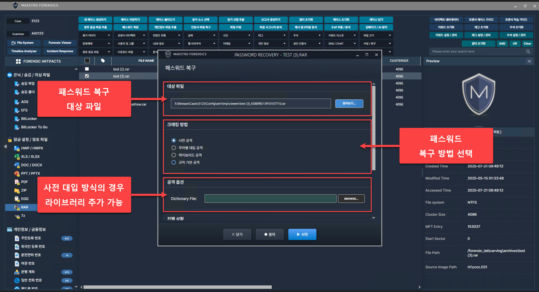 파일 복호화 방식 선택 후 패스워드 복호화 시도 가능.