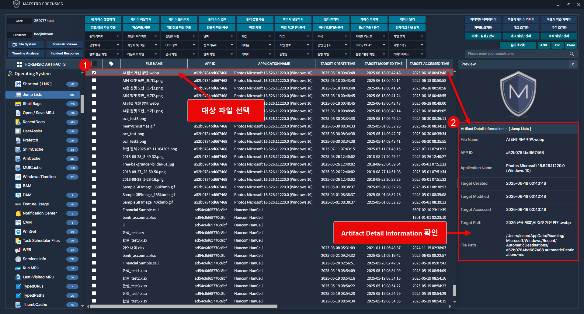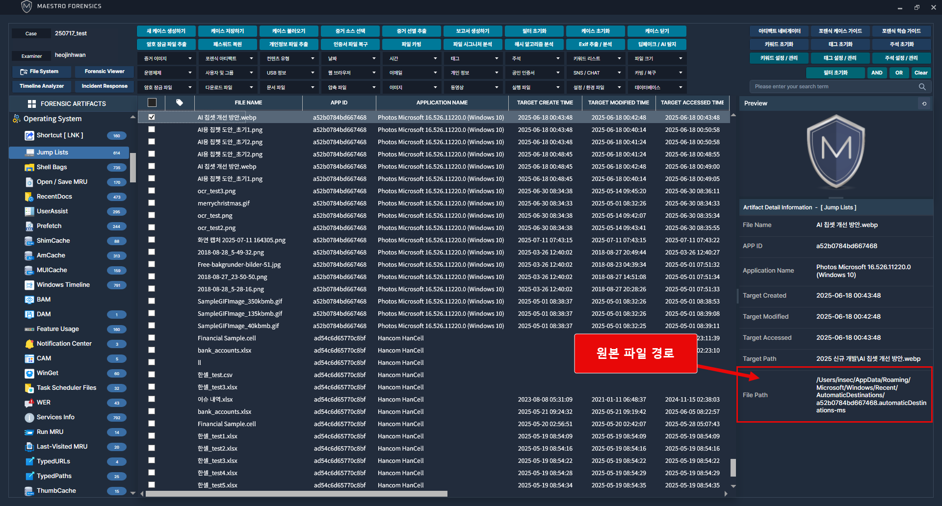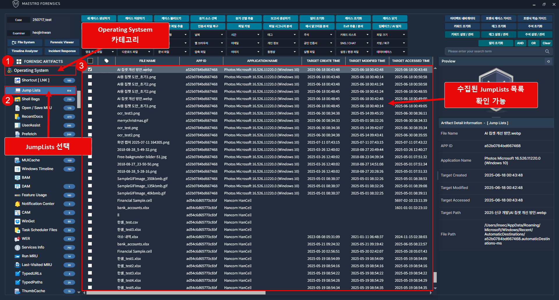 MEASTRO Wisdom을 통해 점프리트스 아티팩트를 분석하기 위해 [Operating System] 그룹의 [Jumplist] 카테고리로 이동.