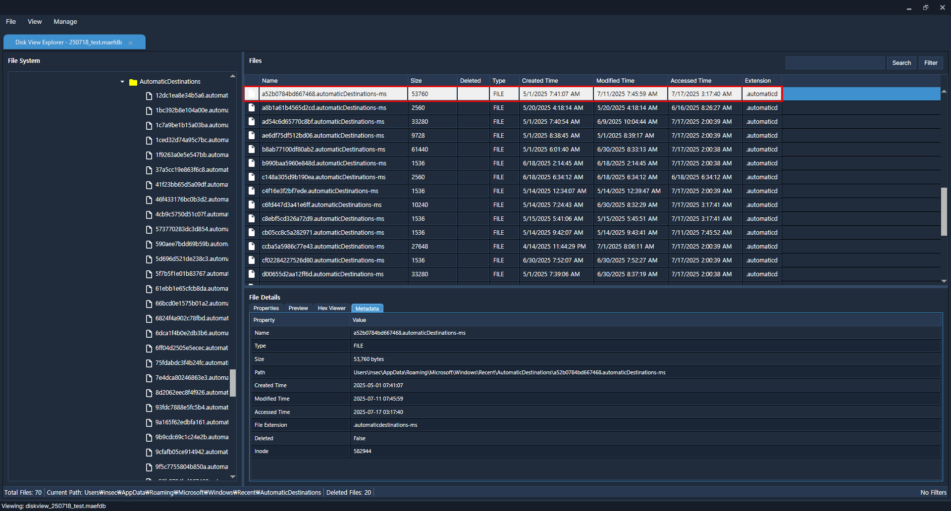 특정 <행> 클릭 후 [Artifacts Detail Information]창을 통해 메타데이터 정보 식별 가능
