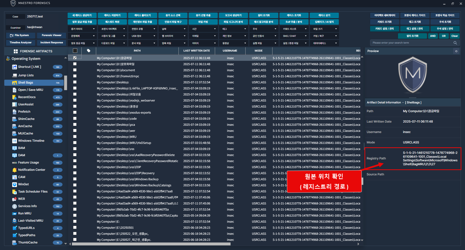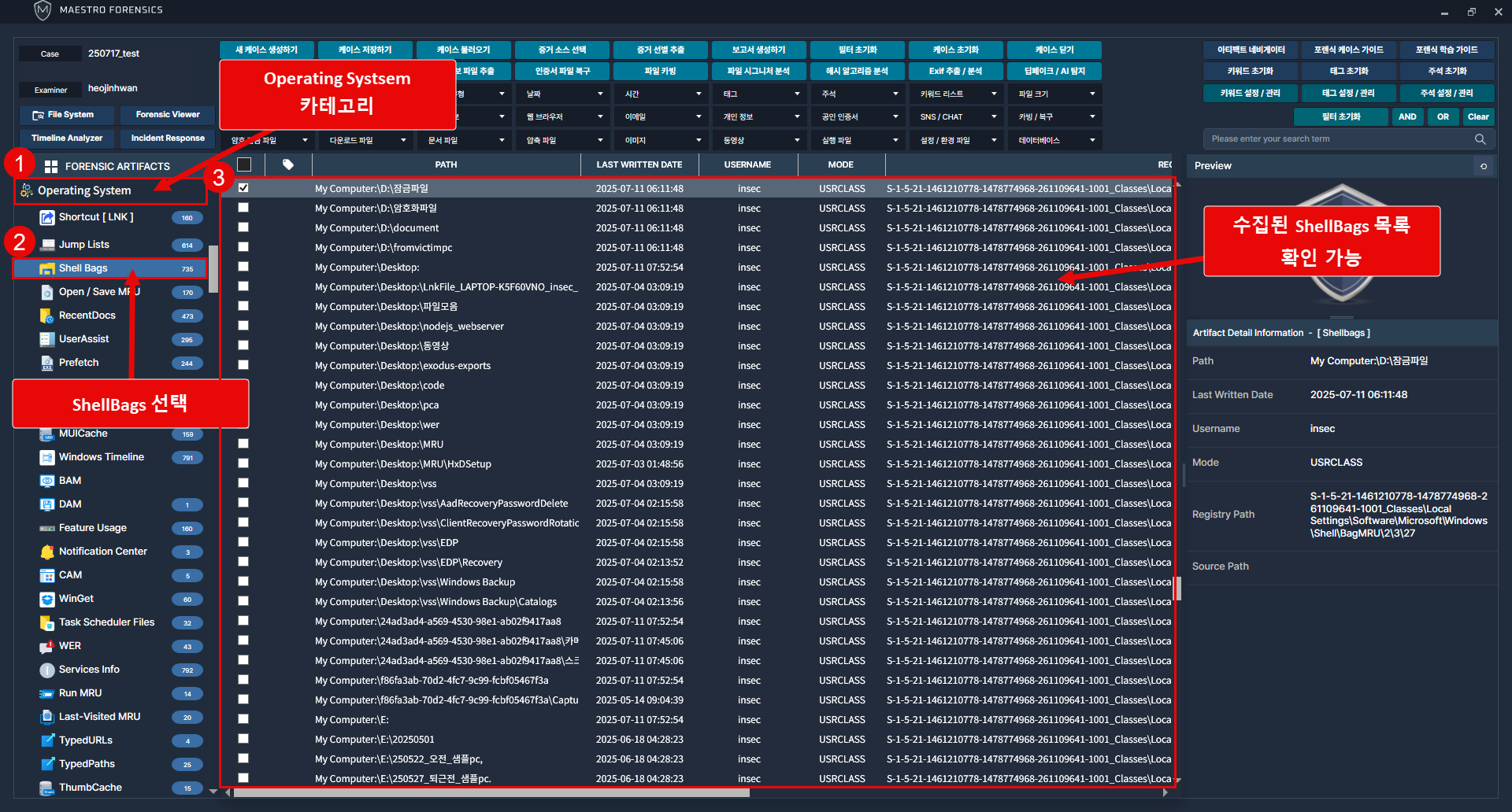MEASTRO Wisdom을 통해 폴더 접근 기록을 분석하기 위해 [Operating System] 그룹의 [Shell Bags] 카테고리로 이동.