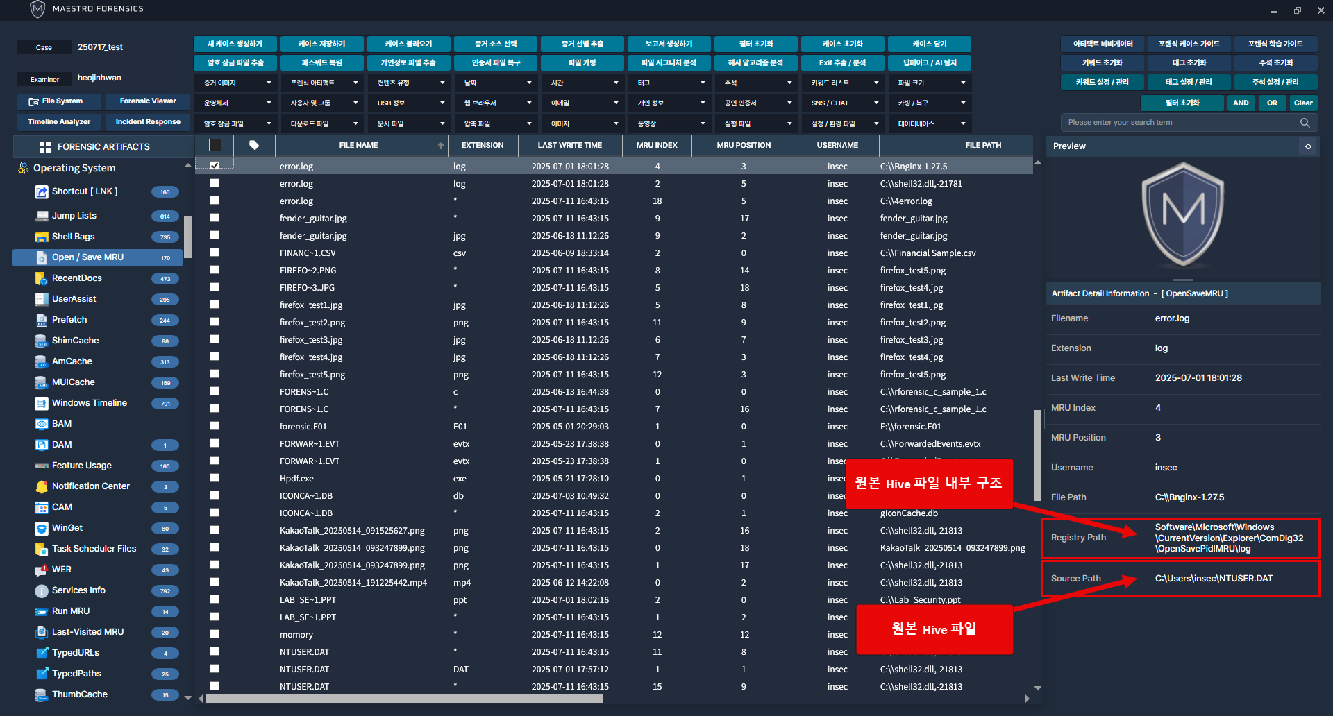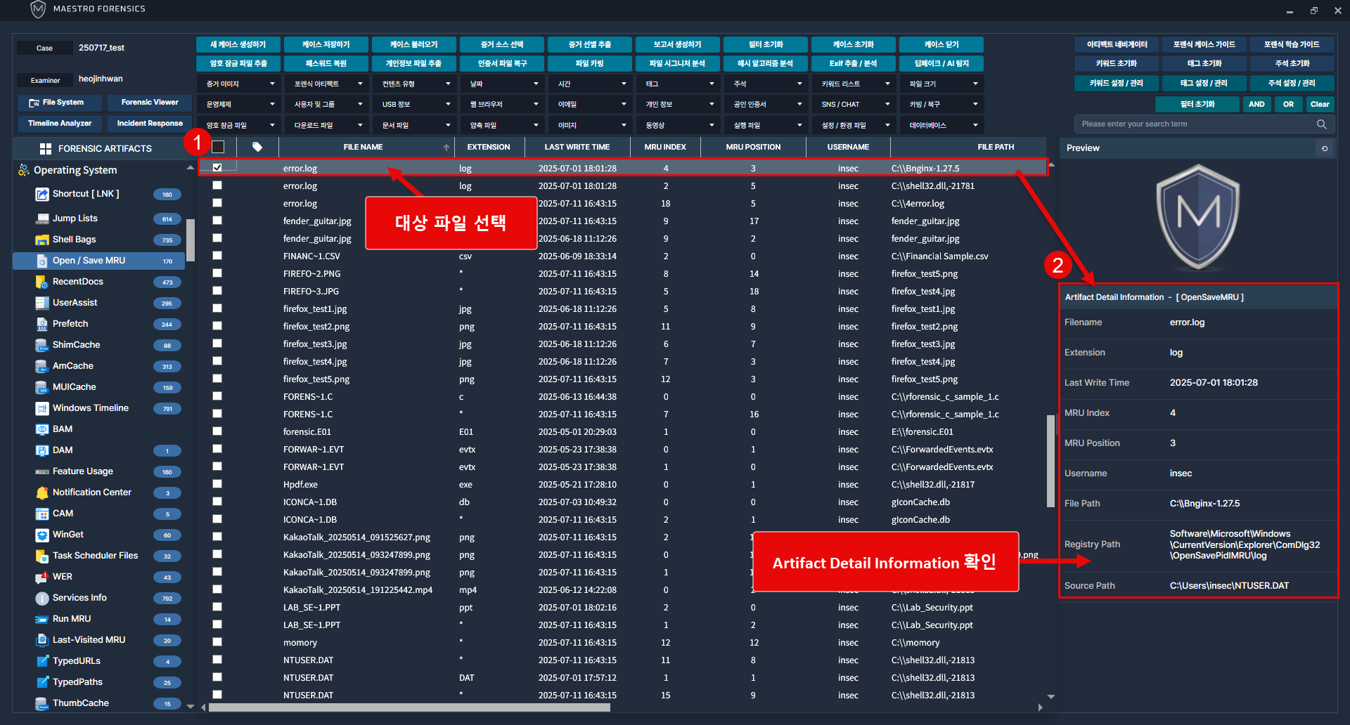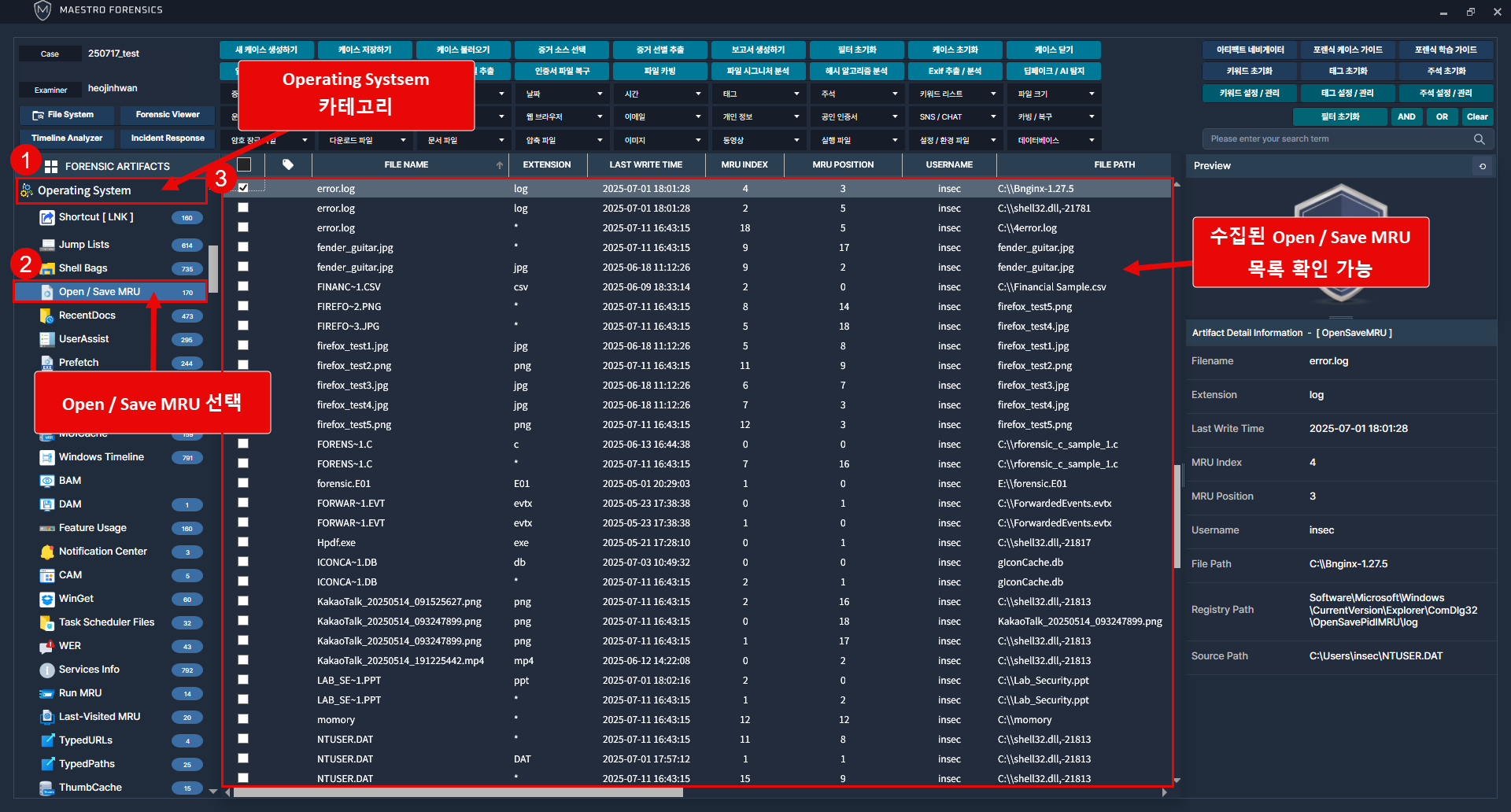 MEASTRO Wisdom을 통해 최근 실행/저장된 문서 아티팩트를 분석하기 위해 [Operating System] 그룹의 [Open/Save MRU] 카테고리로 이동.