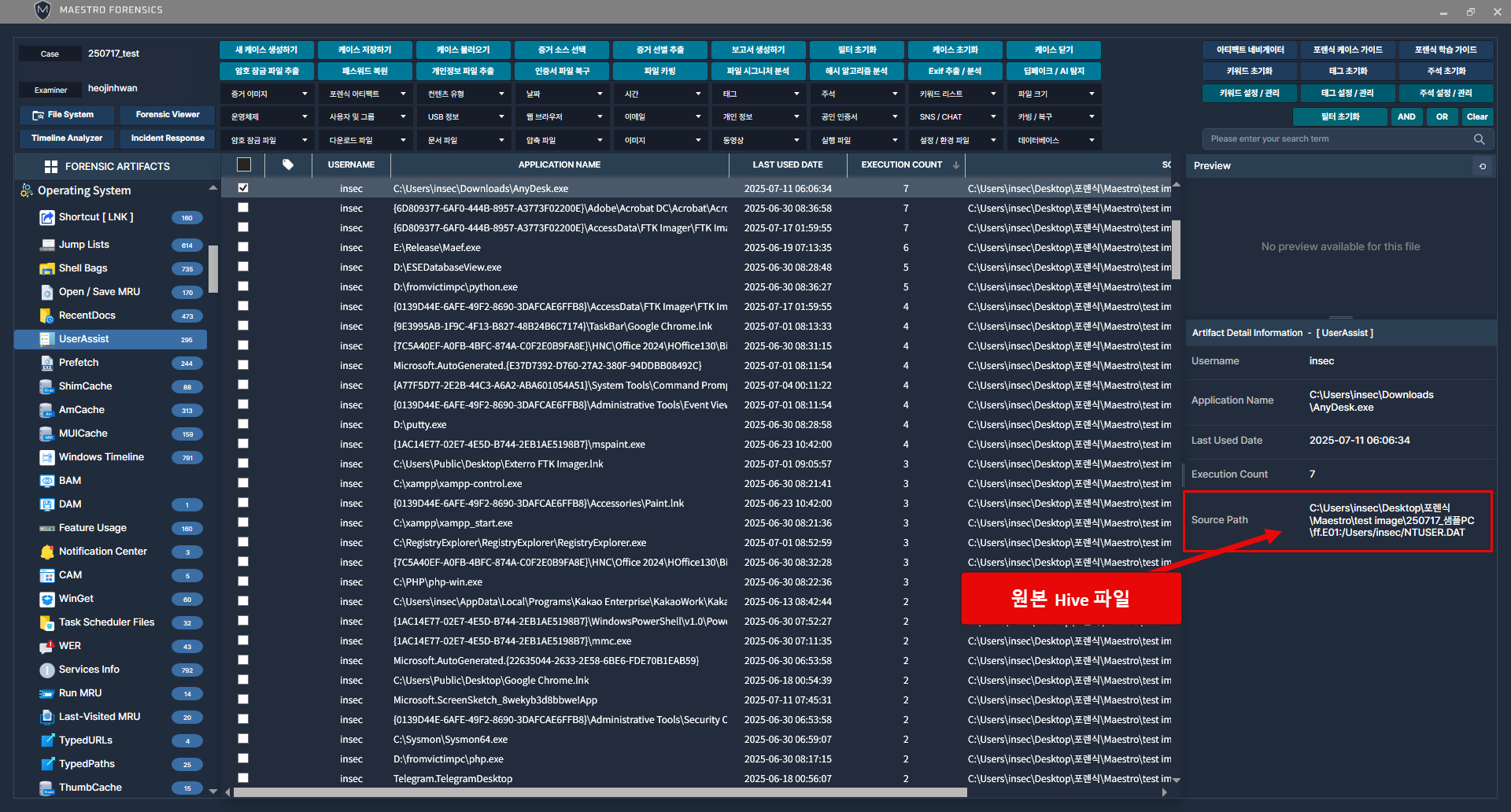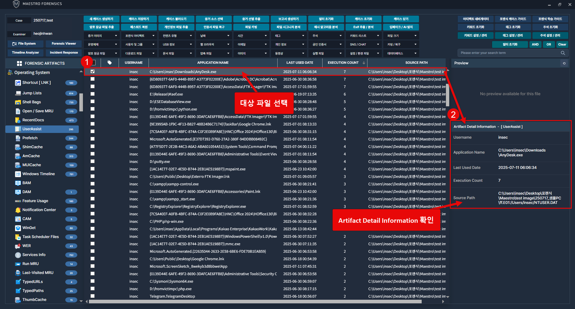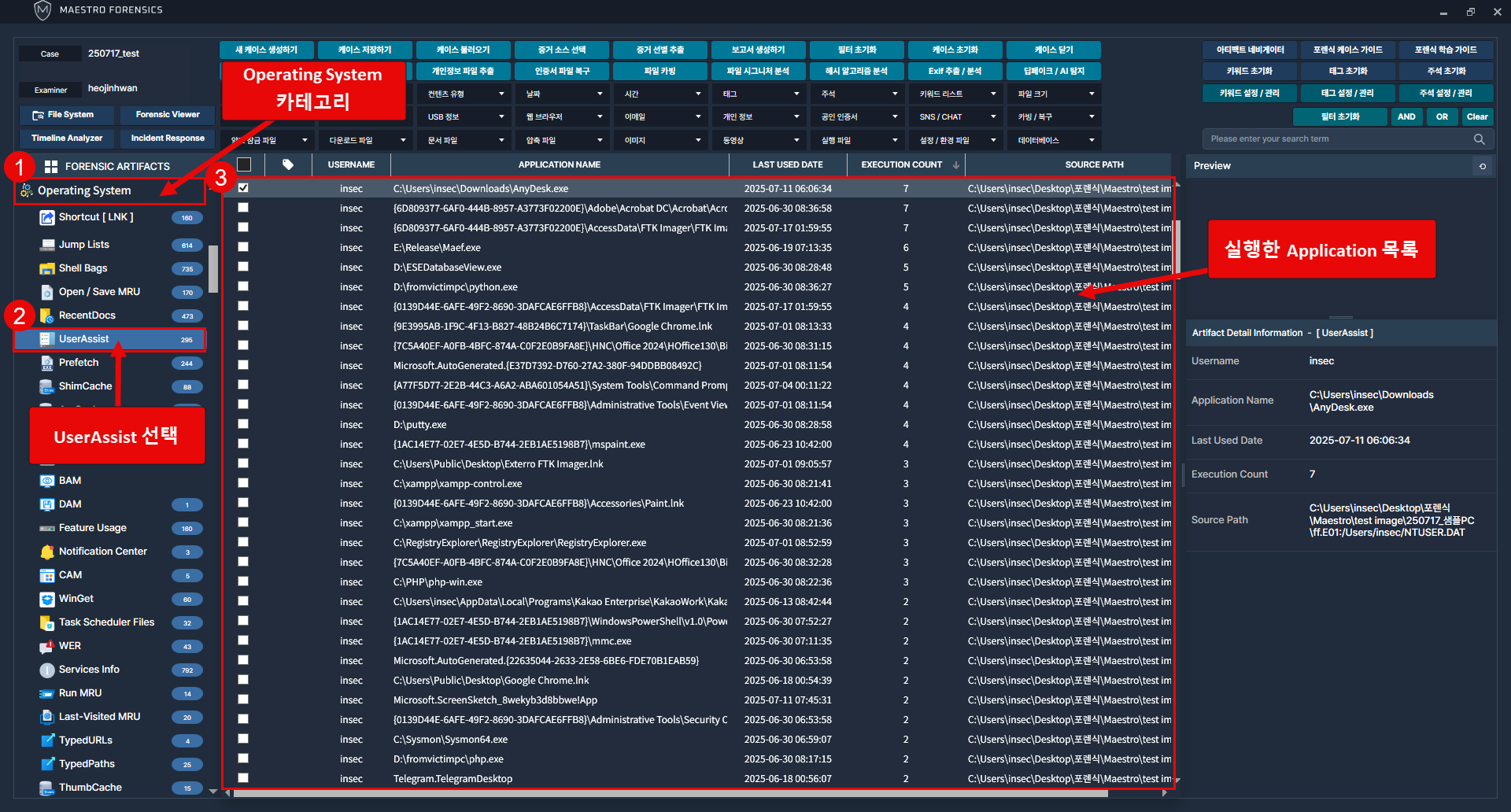 특정 사용자 계정으로 실행된 애플리케이션 정보를 분석할 수 있으며
