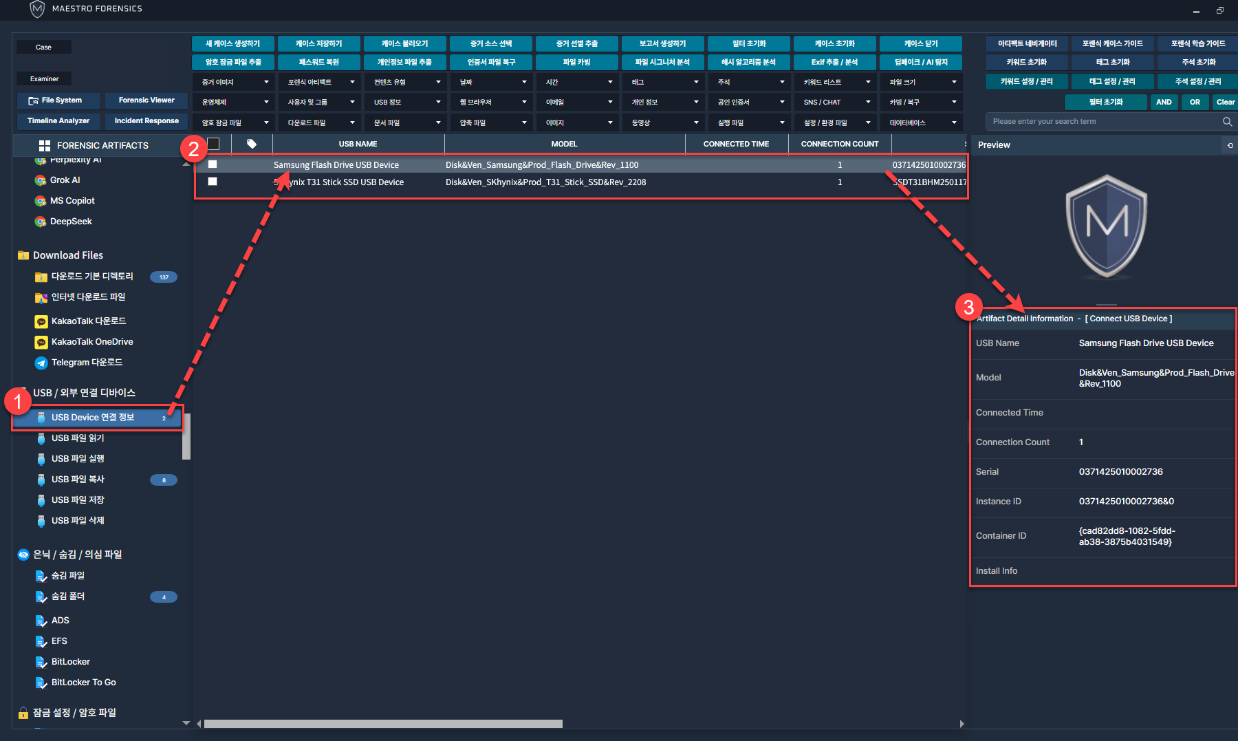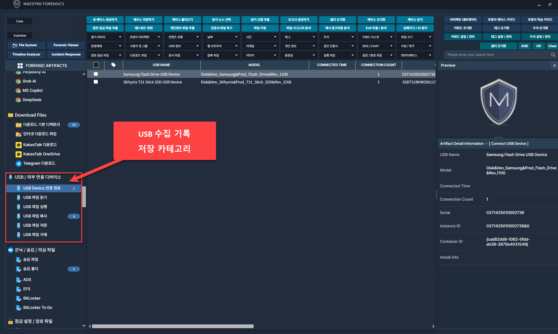 USB 사용흔적 조사를 위해 아티팩트 네비케이터에서 [USB/위부 연결 디바이스] 카테고리로 이동